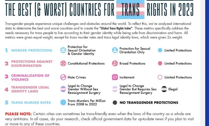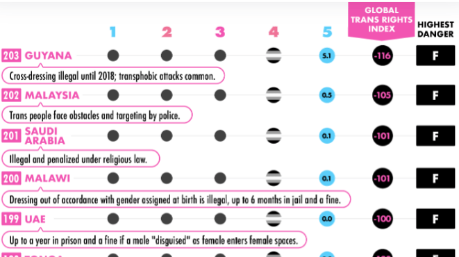 Menurut kajian terbabit, Malaysia, Arab Saudi, Malawi dan Emiriah Arab Bersatu merupakan negara yang paling teruk bagi orang trans. Tiada seorang pun daripada mereka mempunyai perlindungan pekerja, diskriminasi dan dianggap penjenayah. Berpakaian seperti wanita atau cross dressing dihukum dengan penalti sehingga penjara di 8 daripada 10 negara paling teruk bagi golong tersebut.
