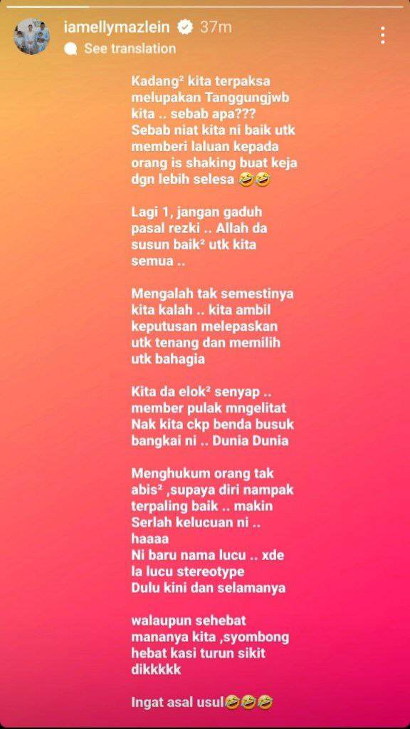 "Lagi satu, jangan gaduh pasal rezeki, Allah susun baik-baik untuk kita semua. Mengalah tak semestinya kita kalah, kita ambil keputusan melepaskan untuk tenang dan memilih untuk bahagia."- ujarnya.