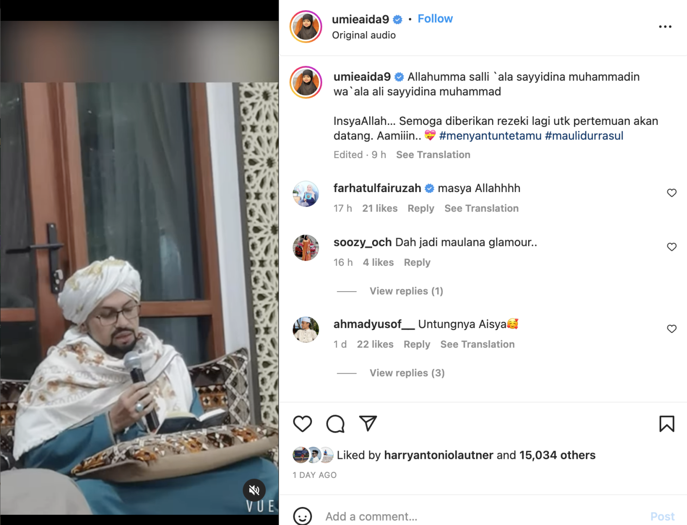 "Kalau di Facebook, macam-macam hinaan. Walhal nak sambut Maulidul Rasul sahaja. Kalau artis luar datang sanggup bayar Rm500 ke RM600 elok pula manusia toksik di Malaysia ni. "Yang datang untuk hiburan disanjungi. Yang datang untuk kebaikan amalan, dicaci. Takutnya akhir zaman.
