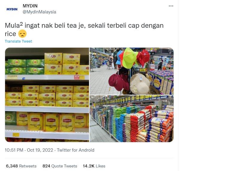 Terdahulu, Mydin dalam hantaran di Twitternya semalam telah memuat naik beberapa keping gambar memaparkan teh, topi serta beras dengan kapsyen “Mula-mula ingat nak beli ‘tea’ (teh) je, sekali terbeli ‘cap’ (topi) dengan ‘rice’ (nasi)”.