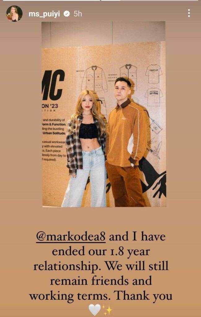 Hujung tahun lalu, Ms Puiyi mengumumkan hubungannya bersama Mark secara terbuka dengan memuatnaik video mesra mereka ketika bercuti di London semasa Hari Krismas. Namun, menerusi Instagram Story pada 19 Ogos yang lalu Ms Puiyi mendedahkan hubungan mereka berdua telah berakhir.