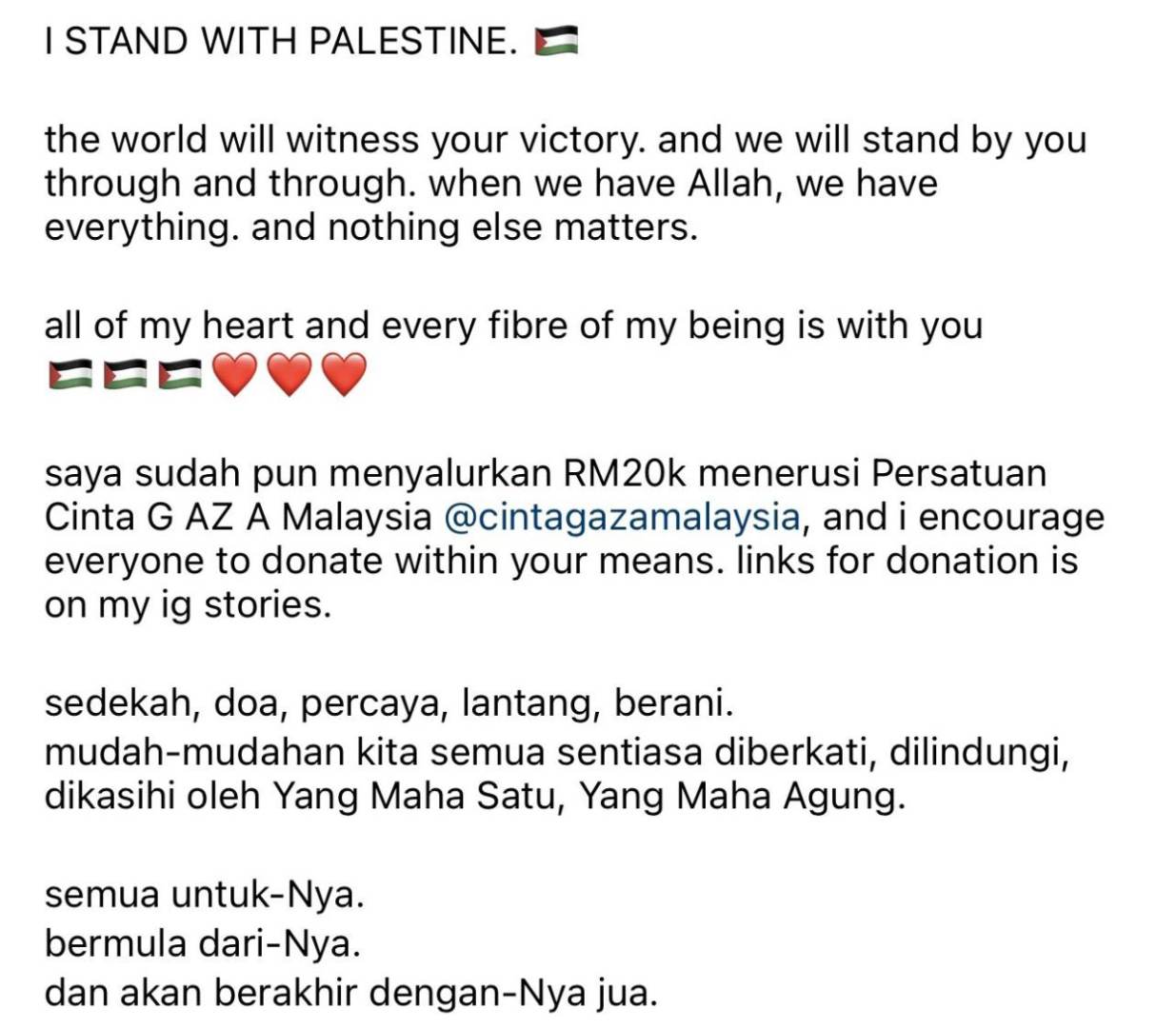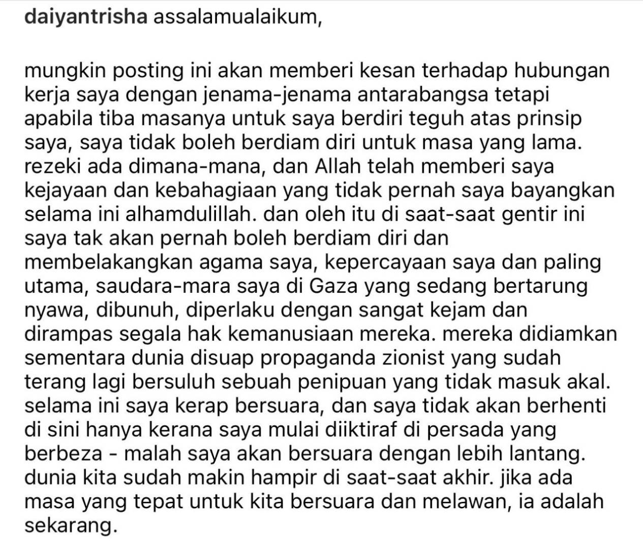 "Assalamualaikum, mungkin hantaran ini akan memberi kesan terhadap hubungan kerja saya dengan jenama-jenama antarabangsa tetapi apabila tiba masanya untuk saya berdiri teguh atas prinsip saya, saya tidak boleh berdiam diri untuk masa yang lama," ujarnya.