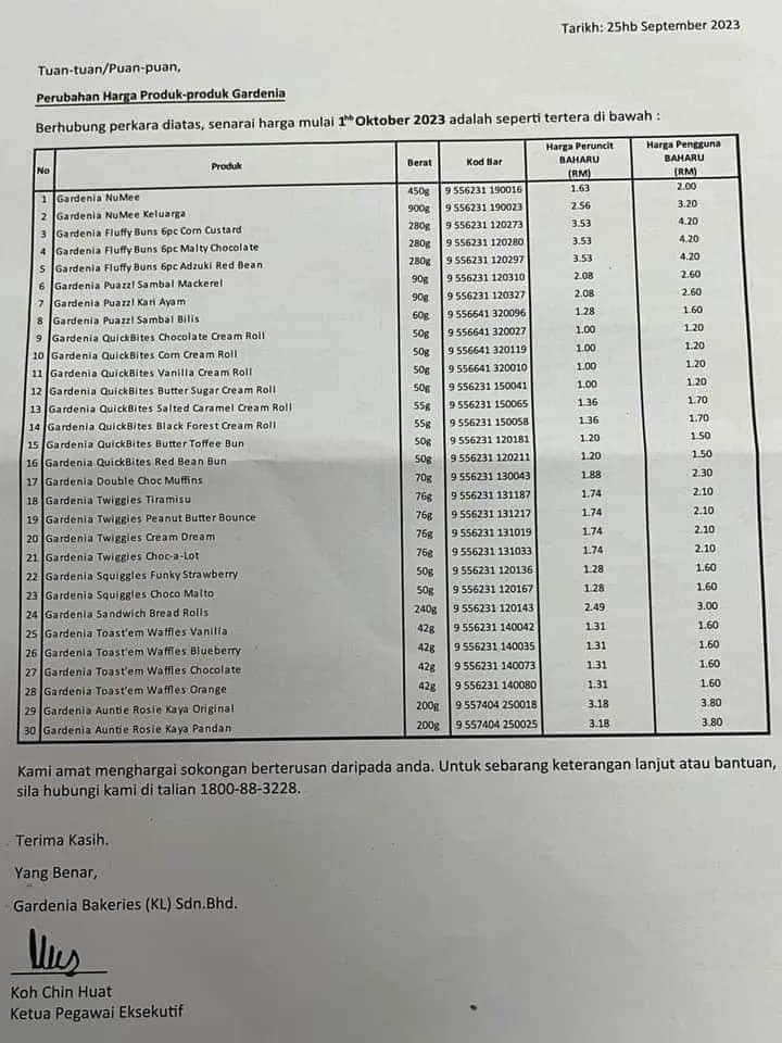 Ini berikutan sebuah notis menjadi tular di media sosial memperlihatkan senarai perubahan harga produk-produk Gardenia berkenaan.