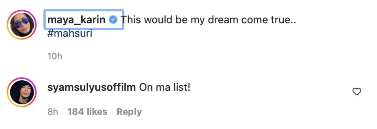 Di Instagram, hasrat Maya ternyata berjaya mendapat perhatian pengarah berusia 38 tahun itu. Menerusi kapsyen, Syamsul seolah-olah bercadang untuk menterjemah watak ikonik berkenaan ke layar perak. Tambah Syamsul, idea yang diusulkan oleh Maya sangat bagus dan boleh direalisasikan pada masa akan datang.
