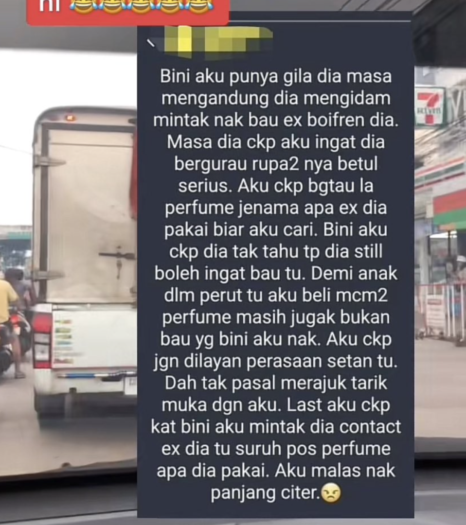 Menerusi perkongsian tersebut yang dikongsikan kembali di Twitter, pada awalnya lelaki itu menyangka bahawa ia hanya gurauan semata-mata tetapi si isteri nekad untuk meminta suaminya mencari wangian yang sering dipakai oleh bekas teman lelakinya itu.