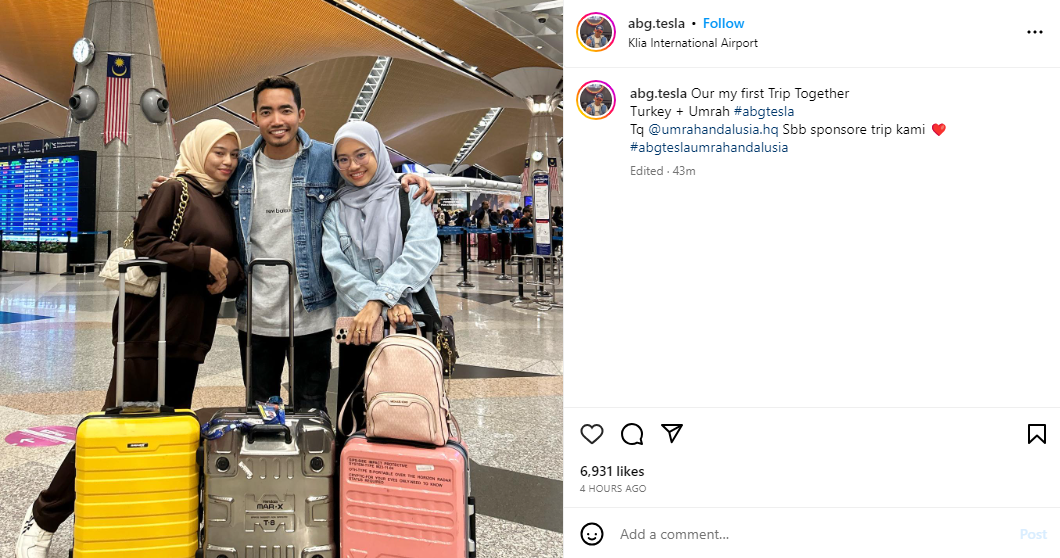 Abang Tesla atau nama sebenarnya Muhammad Khal Iltizam Yusry memuat naik gambar bersama kedua-dua isterinya sebelum berangkat menunaikan umrah dan melancong ke Turki di akaun Instagramnya.
