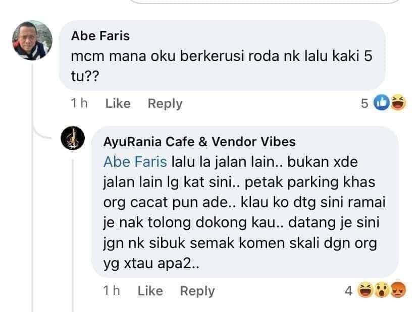 Tak cukup dengan itu, respon dari tuan kedai juga bernada sombong dan juga biadap. Tak cukup dengan pertahankan pendirirannya, dia keluarkan kenyataan yang tidak sensitif terhadap golongan OKU.
