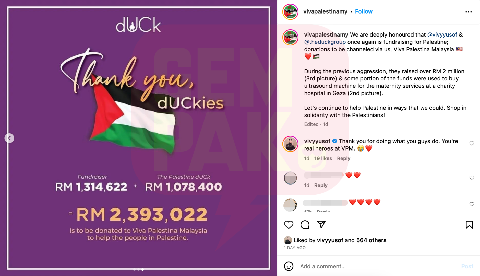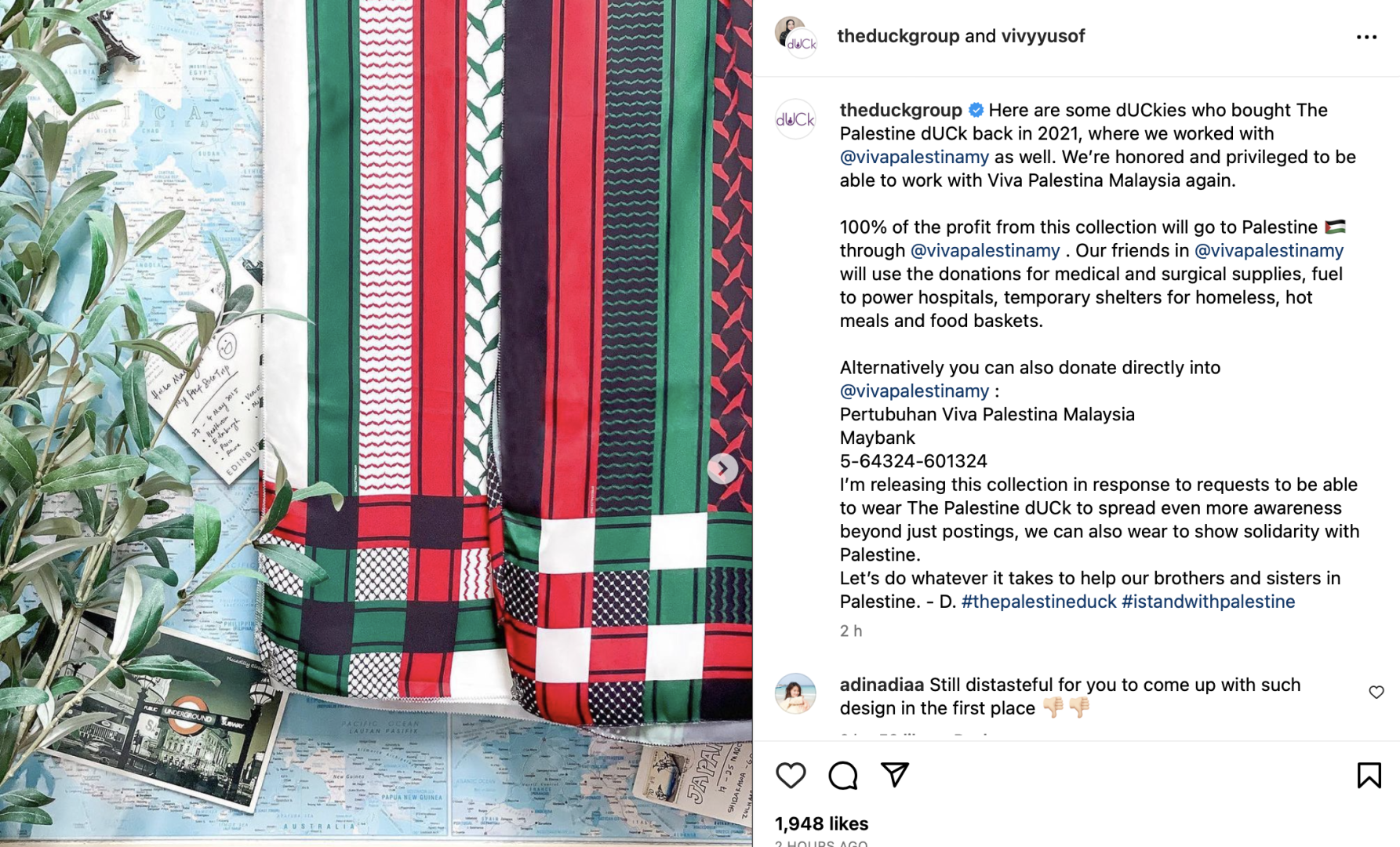 Vivy menerusi IG story, memaklumkan, bahawa syarikatnya sama sekali tidak akan mengambil sebarang wang hasil pembelian pelanggan menerusi koleksi dUCK Palestin.