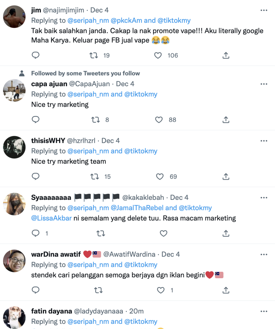 Setelah diselidik beberapa pengguna Twitter yang lain, difahamkan video yang tular itu merupakan salah satu cara marketing yang dilakukan sebuah syarikat menjual vape.