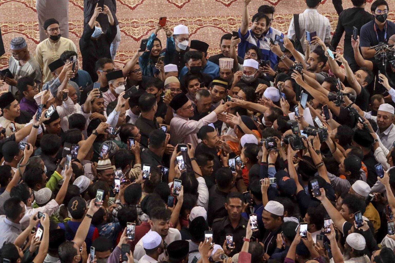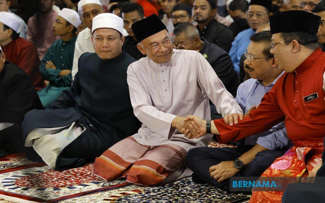 Datuk Seri Anwar sempat bersalaman dengan para jemaah sebelum masuk ke Dewan Solat masjid untuk mendengar khutbah bertajuk 'Nasihat Buat Pemimpin: Khalifah Umar Bin Abdul Aziz Contoh Teladan,' yang dibacakan Imam Besar Masjid Putra Salahuddin Ghozali dan menunaikan solat Jumaat.