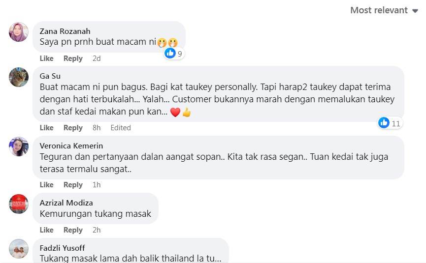 “Sudah dua kali saya datang, dua-dua datang tak sedap macam dulu dah. Tom yam apa ini, tak ada rasa masam, pedas, manis, lemak. Cuma rasa udang kering je lebih, sedihnya,” tulis pelanggan itu di dalam satu nota.
