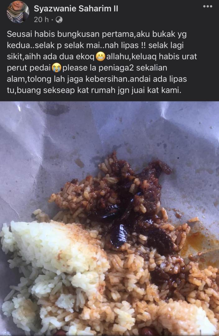 Syazwani Saharim hanya menyedari kehadiran lipas yang sudah mati ketika makan bungkusan nasi kedua.