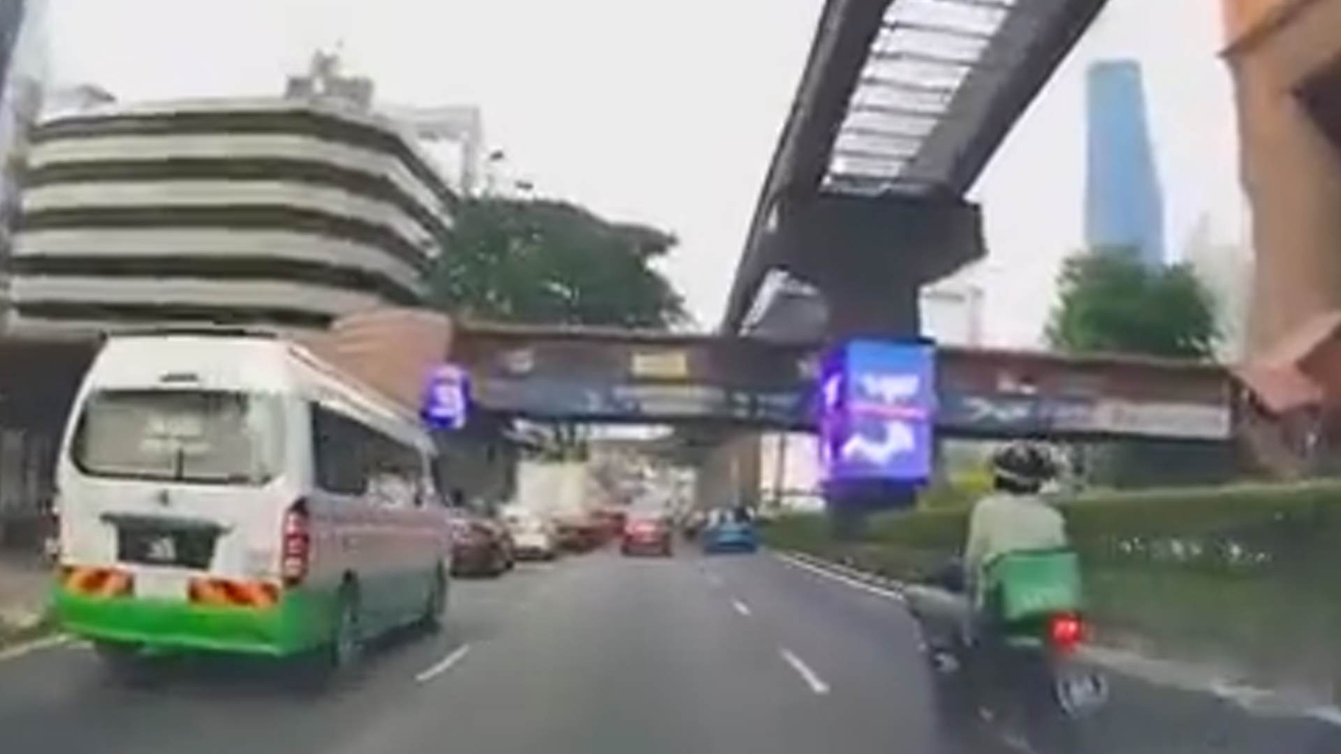 Aksi santai dan berbahaya penghantar makanan itu sempat dirakam menerusi kamera papan pemuka (dashcam) orang awam yang berada di lokasi kejadian.