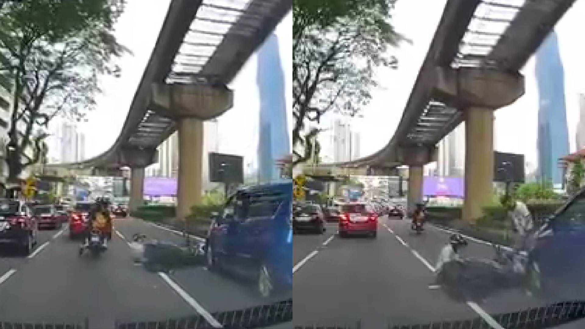 Tindakannya itu membawa padah selepas dia merempuh bahagian belakang sebuah kereta sekali gus menyebabkannya jatuh ke lorong kanan jalan. Lelaki itu juga hampir dilanggar kenderaan lain yang melalui laluan tersebut.