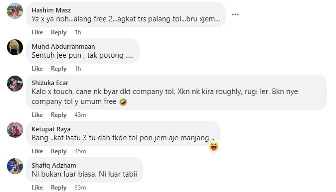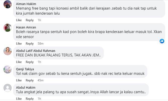 Bagaimanapun ada juga netizen menjelaskan mengapa pengguna masih perlu menyentuh kad Touch n Go di tol meskipun percuma adalah disebabkan syarikat konsesi tol akan memungut rekod jumlah kenderaan yang melaluinya agar memudahkan mereka mendapatkan semula bayaran daripada Kerajaan.