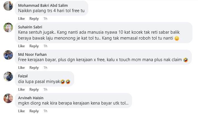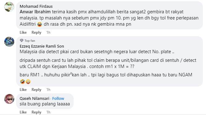 Meskipun ramai yang bersyukur dengan pengecualian bayaran tol selama 4 hari untuk semua pengguna jalan raya yang akan pulang ke kampung halaman sempena Aidilfitri di bawah nama 'Tol Rahmah' seperti diumum Datuk Seri Anwar -- namun masih ada juga segelintir netizen yang menyifatkan pengumuman tol berkenaan adalah sama sahaja seperti zaman pentadbiran beberapa PM terdahulu.
