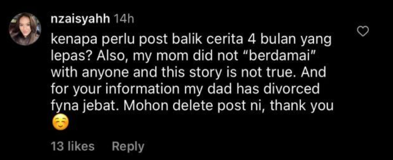 "Ibu saya tidak pernah berdamai dengan sesiapa dan berita ini tidak benar dan untuk pengetahuan anda bapa saya sudah menceraikan Fyna Jebat.