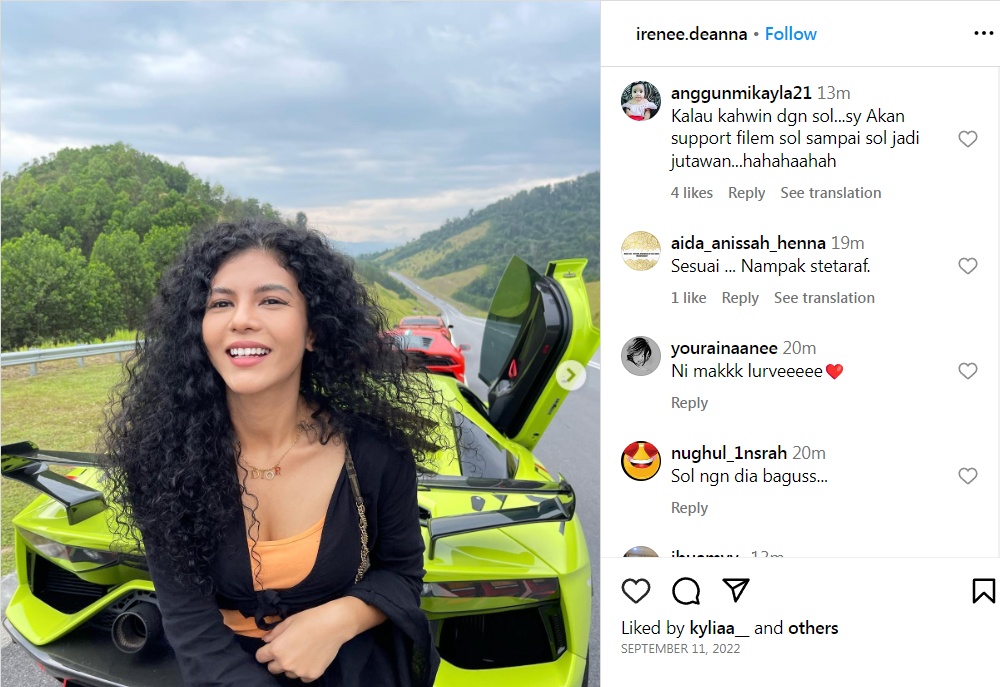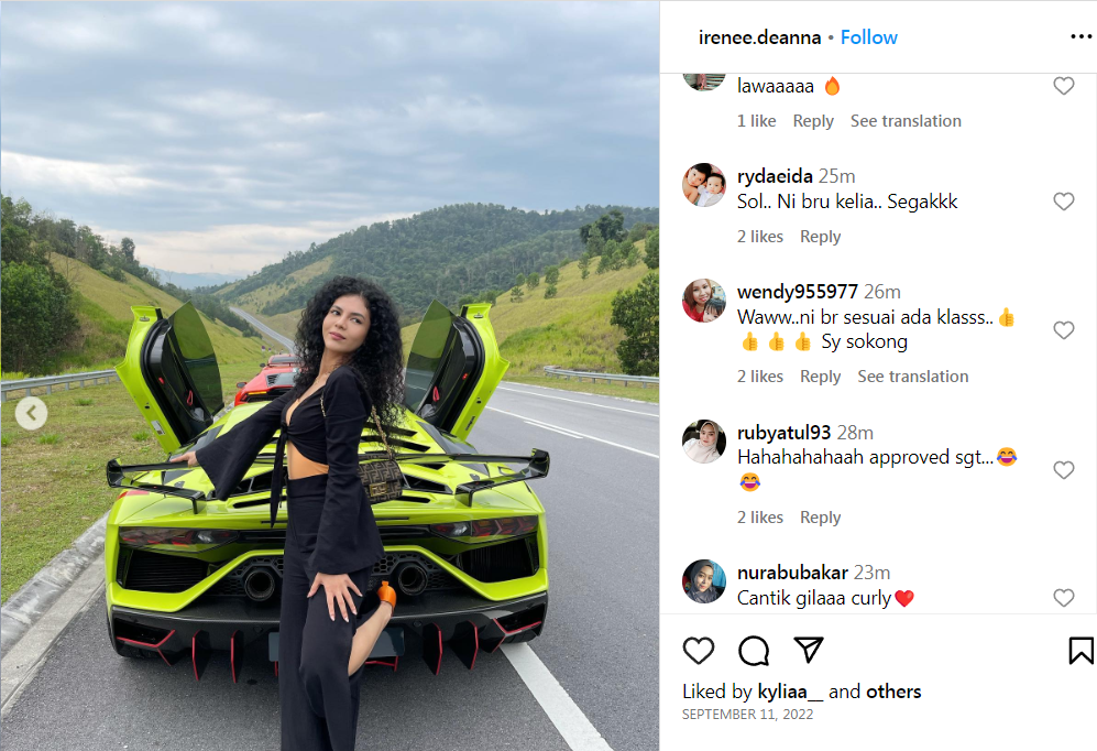 Sementara itu, menjengah ke Instagram wanita jelita berambut kerinting itu bernama Irene Deanna yang juga seorang usahawan bidang permotoran serta sama-sama turut meminati kereta mewah dan sport car sama seperti Syamsul.