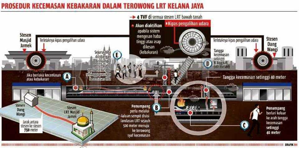 Beliau berkata, syaf keselamatan itu menghubungkan Dang Wangi dan Masjid Jamek serta Kampung Baru dan KLCC untuk menghadapi saat cemas sama ada terperangkap atau kebakaran di laluan bawah tanah sepanjang 4.5 kilometer (km), yang menjadi sebahagian daripada 46.7 km laluan LRT Kelana Jaya.