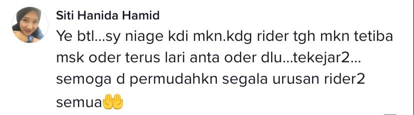 Dalam pada itu, mereka turut mendoakan agar urusan para rider penghantar makanan di luar sana dipermudahkan dan dimurahkan rezeki dalam mencari sumber pendapatan yang halal.