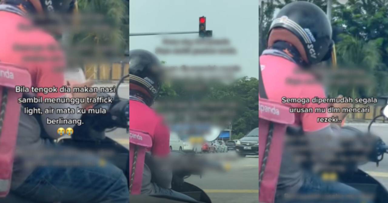 "Sorry abang Foodpanda saya ambil gambar awak. Semoga dipermudakan segala urusanmu dalam mencari rezeki. Bila tengok dia makan nasi sambil tunggu lampu isyarat, air mataku mula berlinang. Percayalah usahamu tak akan pernah mengkhianatimu."
