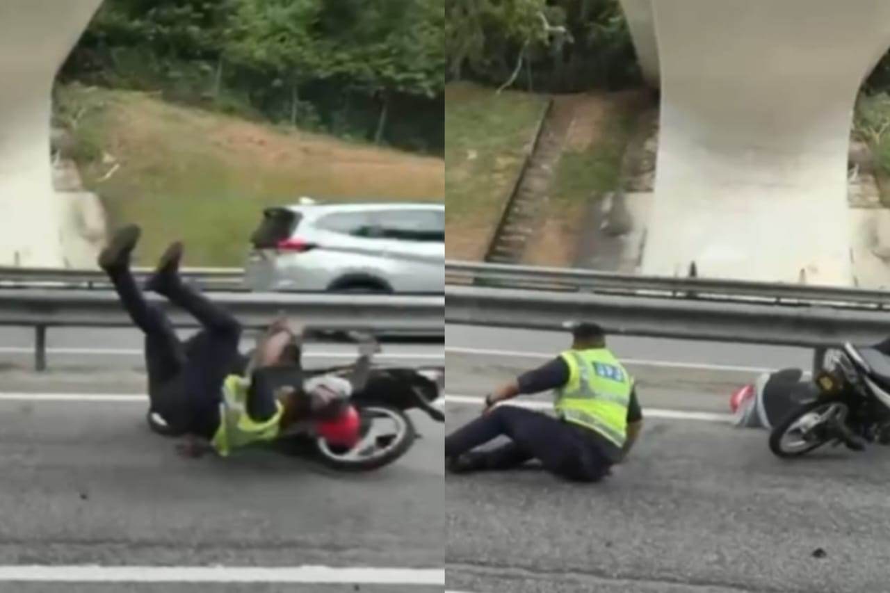 Rakaman video memaparkan anggota JPJ berkenaan yang dilihat tercampak beberapa meter akibat dilanggar penunggang tersebut turut ditularkan di media sosial.