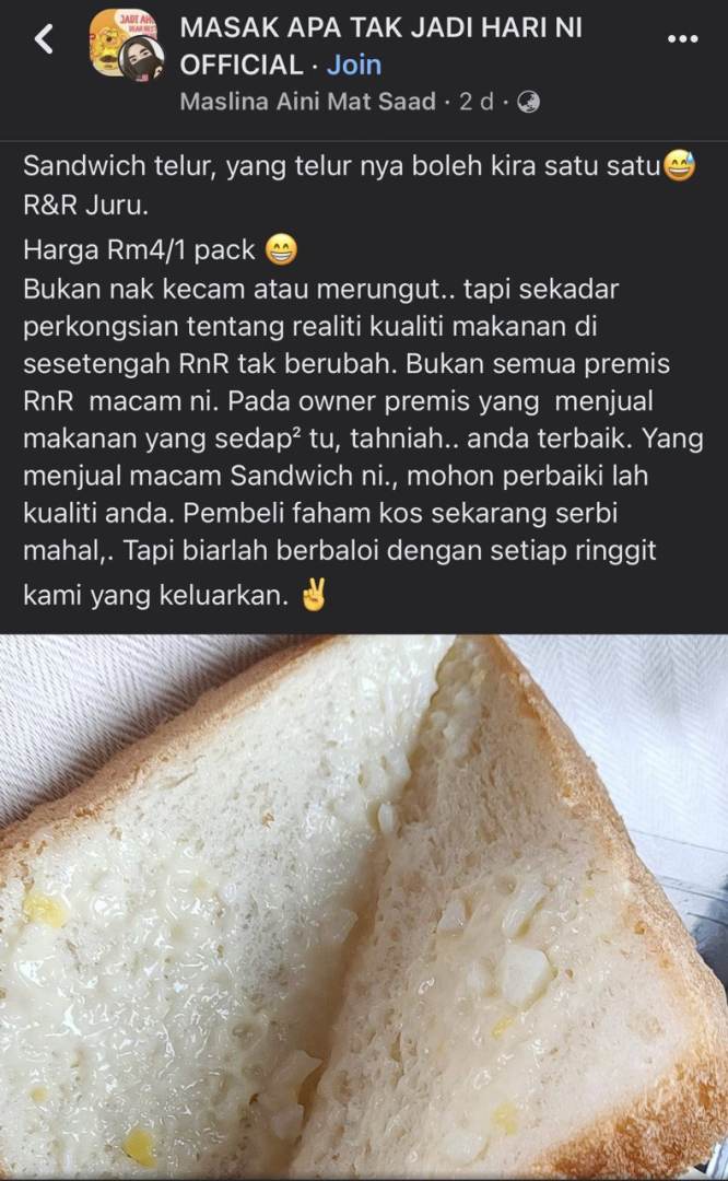Kejadian malang itu menimpa seorang pengguna Facebook bernama Maslina Aini Mat Saad, yang dikatakan membeli sandwich telur pada harga RM4 sepaket di kawasan Rehat dan Rawat (R&R) Juru, Pulau Pinang.